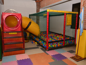Pelotero en el patio interno y patio con juegos exteriores especiales para los niños de Kindergarten con pasto sintético.